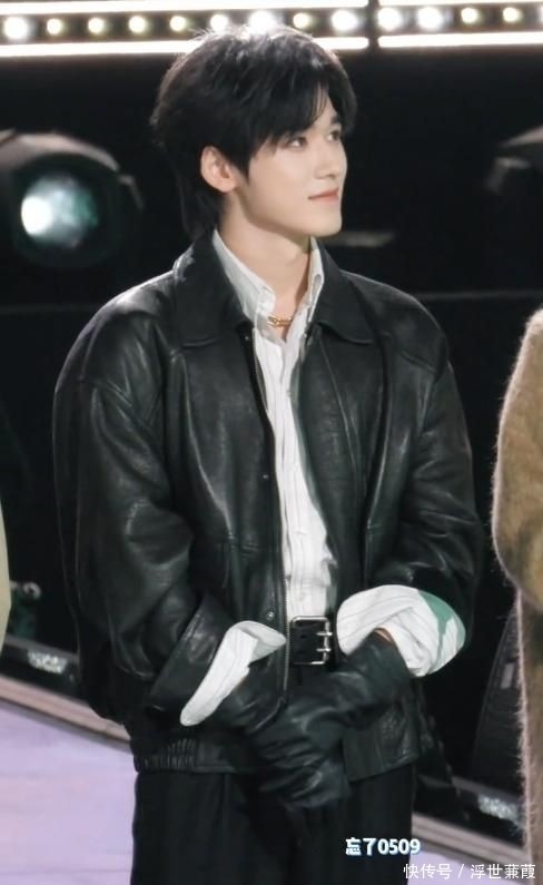 宋亚轩的穿搭路线与马嘉祺如出一辙,身着黑色皮质夹克搭配纯白衬衣,走的是冷峻贵公子风。剪裁合体的皮衣凸显其肩线轮廓,手戴黑色皮手套,为整体增添几分贵族气息。妆面处理更为轻盈,底妆薄透却遮盖了所有肤质细节,唇色呈现自然粉调,仿佛未经雕饰却实则精雕细琢。